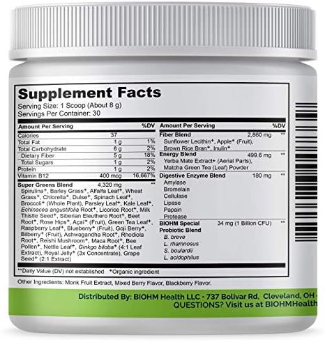 Superfood Supplement With Probiotics: Scientifically formulated with BIOHM’s proprietary probiotic and prebiotic blend, this premium green supplement has combined good bacteria and good fungi to support gut health and help destroy digestive plaque. Digestive enzymes found in our super greens supplement can also boost absorption.