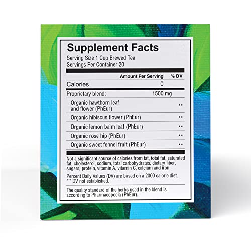 Ingredients: Organic Hawthorn, Organic Hibiscus, Organic Lemon Balm, Organic Rose Hip, Organic Sweet Fennel