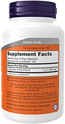 NOW L-Arginine comes in 500 mg capsules and is non-GMO. Arginine is a conditionally essential basic amino acid involved primarily in urea metabolism and excretion, as well as in DNA synthesis and protein production.* It is an important precursor of nitric oxide (NO) and thus plays a role in the dilation of blood vessels.* The L-Arginine used in this product is pharmaceutical grade. Natural color variation may occur in this product.