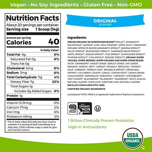 50 superfoods per scoop from Orgain’s original organic super sprouts, fruits, berries, veggie, greens, grasses, and foods blends. 1 billion clinically proven probiotics, 6 grams of organic dietary fiber, high in antioxidants.