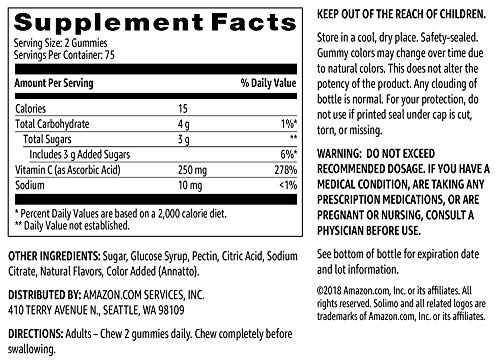 Solimo Vitamin C gummies function bitter orange taste with different pure flavors. They’re vegetarian and gluten-free. Adults – chew two every day.
